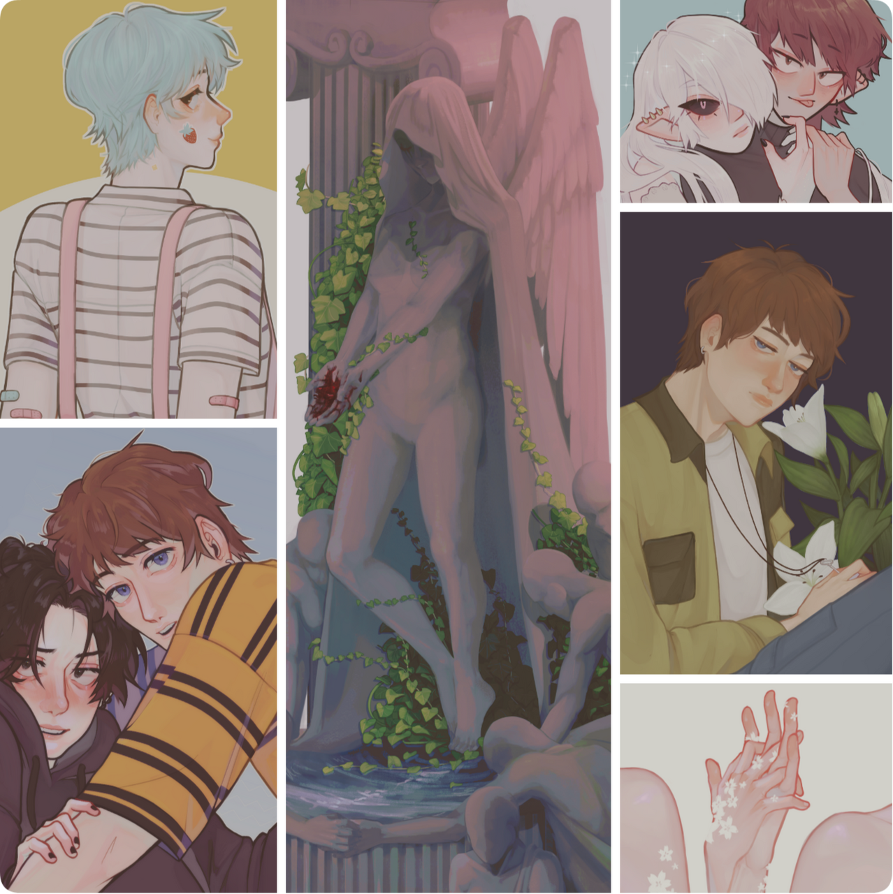 >Humanos, personajes originales, parejas, ships, fan art, icons, soft gore, nsfw soft, semidesnudos, pixel art.Cosas que NO sé dibujar